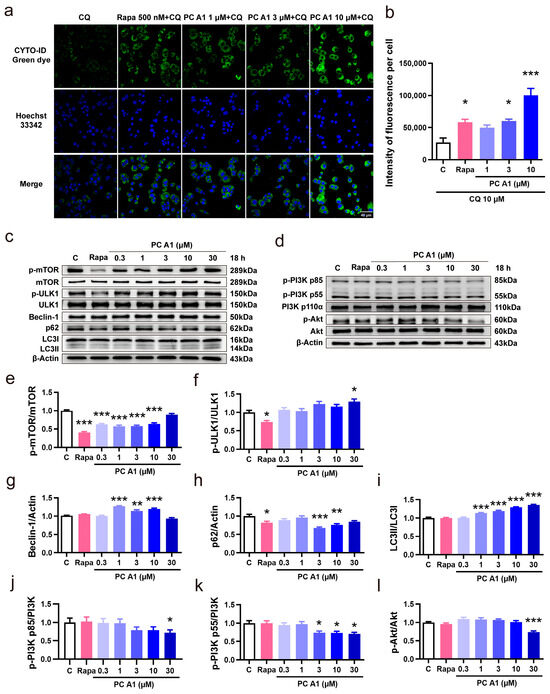 Impaired microautophagy has been proposed as a hallmark of aging [7]. Autophagy is the cellular process by which portions of the cell, including macromolecules and entire organelles, are degraded within lysosome. CYTO-ID® green dye, a fluorescent probe, serves as an effective marker for vesicles produced during autophagy. To assess the capacity of PC A1 to induce autophagy, CQ was employed to block the conversion from autophagosomes to autolysosomes by elevating the lysosomal/vacuolar pH. Rapa was used as a positive control for its known capacity to induce autophagy by inhibiting TOR (in particular, TOR complex 1) activity [15]. As shown in Figure 6a,b, Rapa (500 nM) and PC A1 (3 and 10 µM) significantly increased the fluorescent intensity of autophagic vacuoles. Given that the conversion from autophagosomes to autolysosomes was blocked by CQ, we conclude that PC A1 effectively induces autophagy in PC12 cells.
