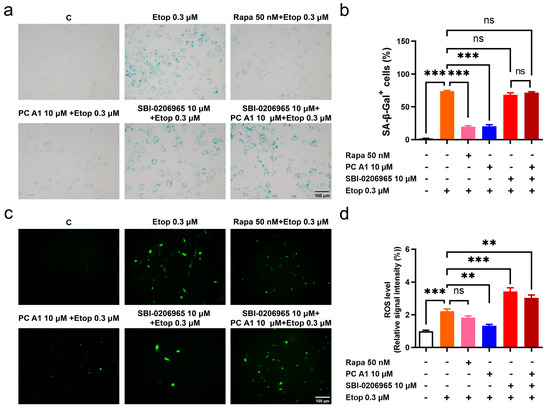 Studies have indicated that many features of aging are interconnected. The impairment of autophagy or genetic defects in autophagy in young cells can lead to a loss of proteostasis, heightened mitochondrial dysfunction, and increased oxidative stress, ultimately resulting in cellular senescence [12]. To test whether the antioxidative stress and cell senescence alleviation effects of PC A1 could be negated by impaired autophagy, SA-β-gal staining and ROS assays were conducted. The selective ULK1 kinase inhibitor SBI-0206965, used to inhibit autophagy in vitro, was administered [32]. The results in Figure 7a indicated that PC A1 at 10 µM distinctly reduced the SA-β-gal+ cell percentage promoted by Etop. However, SBI-0206965 negated this effect of PC A1. The evaluation of ROS yielded results consistent with the SA-β-gal assay. As shown in Figure 7b, Etop at 0.3 µM induced elevated levels of ROS in NIH/3T3 cells; pre-treatment with Rapa (50 nM) and PC A1 (10 µM) reduced ROS levels. Conversely, SBI-0206965 abrogated the ROS scavenging effect of PC A1. The results confirm that there is a crosstalk between autophagy and oxidative stress, as well as cellular senescence. The inhibition of autophagy can obstruct the ROS scavenging and cell senescence elimination effects of PC A1.