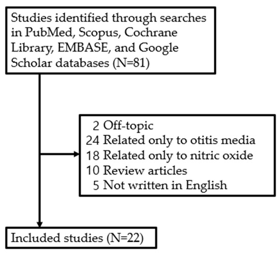 Although the role of NO in various diseases has been studied, there has not been a systematic study on the expression and function of NO in the development of otitis media. Therefore, studies examining recovery from facial nerve injury and the effects of NO published between January 1994 and March 2024 were retrieved from five electronic databases—PubMed, Scopus, Cochrane Libraries, Embase, and Google Scholar—by one of the authors (J.H.Y) based on the search terms ‘otitis media’ and ‘nitric oxide’. The literature search focused on studies published in English, including (1) prospective or retrospective studies on NO in otitis media and (2) studies involving humans and animals. However, studies were excluded if they were (1) unpublished data, (2) review articles, (3) grey literature, (4) case reports, or (5) duplicates. As a result, a review of the literature was conducted on 22 studies, excluding 59 out of a total of 81 studies retrieved (Figure 2).