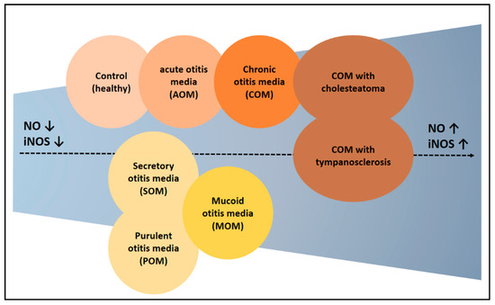 Contrary to the existing studies, one study reported decreased iNOS. Adenoid samples from the children with OME showed a lower iNOS expression compared to samples from the children without middle ear disease. It was suggested that local induction of iNOS in adenoids might be important in preventing OME development [40]. However, considering that the study involved adenoids rather than inflammatory cells or effusion from the middle ear, the direct target organ of otitis media, there are issues in comparing these results with other studies.
