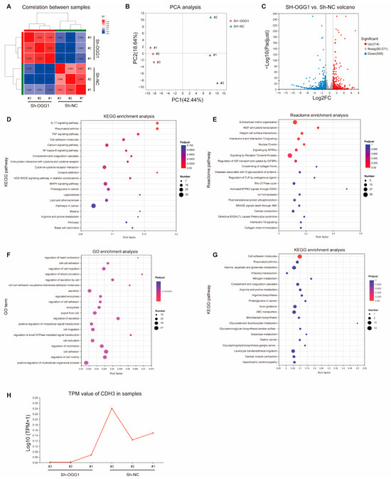 Transcriptome sequencing after the knockdown of OGG1 in A549 cells under oxidative stress. (A) The correlation analysis between samples. (B) The principal component analysis (PCA) between PC 1 and PC 2. (C) Volcanic map of differentially expressed genes. (D) KEGG enrichment analysis of DEGs. (E) Reactome enrichment analysis of DEGs. (F) GO enrichment analysis of significantly downregulated DEGs. (G) KEGG enrichment analysis of significantly downregulated DEGs. (H) Transcripts per million (TPM) value of CDH3 in samples.