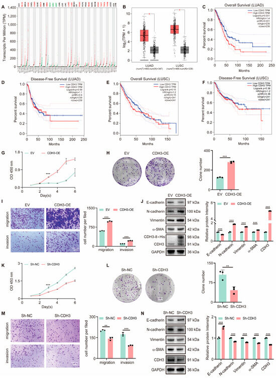 CDH3 is involved in tumor cell proliferation and migration. (A) Pan-cancer analysis of CDH3. Tumors with a significantly higher expression of CDH3 compared to paired normal tissues are labeled in red, while those with a significantly lower expression than paired normal tissues are labeled in green. (B) The CDH3 expression in LUAD and LUSC. The method for differential analysis was one-way ANOVA (* p < 0.05). (C,D) The overall survival (C) and disease-free survival (D) of patients with LUAD, stratified based on their CDH3 expression levels. Solid lines represent survival curves or disease-free survival curves respectively. Dashed lines represent 95% confidence intervals. (E,F) The overall survival (E) and disease-free survival (F) of patients with LUSC, stratified based on their CDH3 expression levels. Solid lines represent survival curves or disease-free survival curves respectively. Dashed lines represent 95% confidence intervals. (G) The growth curve of empty vector (EV) and CDH3-OE A549 cells. (H) The clone formation assay in EV and CDH3-OE A549 cells. Scale bar: 5 mm. Right, quantification of colony numbers. (I) Representative images of the transwell assay in EV and CDH3-OE A549 cells. Scale bar: 100 μm. Right, quantification of migrated cells. (J) Western blot analysis of epithelial-mesenchymal transition (EMT)-related proteins in A549 cells transfected with EV or CDH3-OE. Right, quantification of EMT markers. (K) The growth curve of A549 cells transfected with sh-NC or sh-CDH3. (L) The clone formation assay in A549 cells transfected with sh-NC or sh-CDH3. Scale bar: 5 mm. Right, quantification of colony numbers. (M) Representative images of the transwell assay in A549 cells transfected with sh-NC or sh-CDH3. Scale bar: 100 μm. Right, quantification of migrated cells. (N) Western blot analysis of EMT-related proteins in A549 cells transfected with sh-NC or sh-CDH3. Right, quantification of EMT markers. All experiments were performed with three biological replicates. The statistical significance was assessed using the unpaired Student t-test (** p < 0.01; *** p < 0.001).