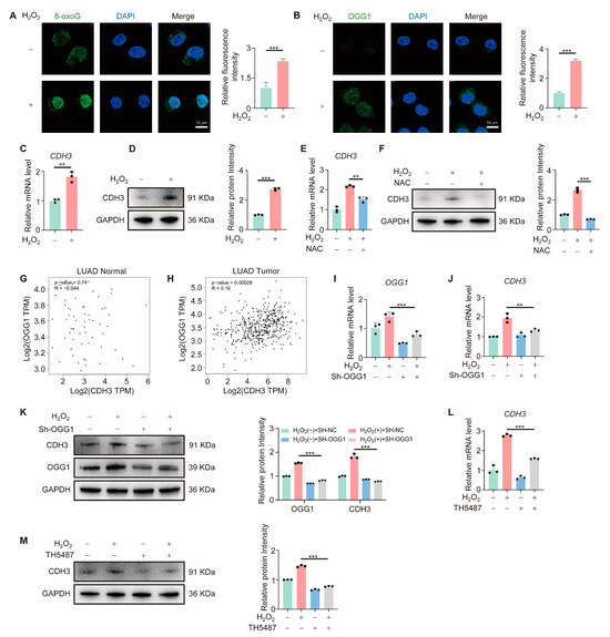 OGG1, a key enzyme in DNA oxidative damage repair, regulates transcription through binding to 8-oxoG [12,25]. To investigate its role in CDH3 regulation under oxidative stress, cells were treated with H2O2. As shown in Figure 3A,B, H2O2 treatment elevated intracellular 8-oxoG levels and induced OGG1 nuclear import, confirming oxidative stress induction. CDH3 expression, both at the mRNA and protein levels, was significantly elevated under oxidative stress (Figure 3C,D), and NAC (N-acetylcysteine—a potent antioxidant) treatment reduced CDH3 expression, confirming its responsiveness to ROS signaling (Figure 3E,F). Next, GEPIA database analysis revealed no correlation between OGG1 and CDH3 expression in normal lung tissue (Figure 3G), but a significant positive correlation in LUAD tissue (Figure 3H). To further explore the role of OGG1 in regulating CDH3 under oxidative stress, A549 cells were transfected with an sh-OGG1 plasmid to knock down OGG1. The results showed that OGG1 knockdown significantly reduced CDH3 expression under oxidative stress (Figure 3I–K), as did treatment with the OGG1 inhibitor TH5487 (Figure 3L,M), which was consistent with transcriptome sequencing data. Taken together, these findings indicate that CDH3 is a potential downstream target of OGG1.