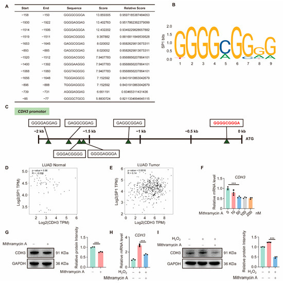 SP1 regulates CDH3 expression. (A) Analysis of the CDH3 promoter. SP1 binding sites in the CDH3 promoter region were predicted using the JASPAR database. (B) SP1 sequence logo. Sequence logos were created online using JASPAR online tools. (C) Position distribution of SP1 binding sites in the CDH3 promoter region with a “Score” greater than 8. The sequence with the highest binding potential is marked in red. (D,E) The correlation analysis between the expression of OGG1 and CDH3 in normal lung tissue (D) and LUAD tissue (E). (F) The mRNA level of CDH3 in A549 cells treated with different concentrations of Mithramycin A. (G) The protein level of CDH3 in A549 cells treated with or without 50 nM Mithramycin A. Right, quantification of CDH3. (H,I) The mRNA (H) and protein (I) levels of CDH3 in A549 cells treated with or without 50 nM Mithramycin A. Right, quantification of CDH3. All experiments were performed with three biological replicates. The statistical significance was assessed using the unpaired Student t-test (*** p < 0.001).