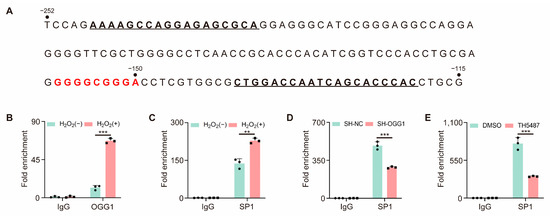 To investigate the role of OGG1 in the regulation of CDH3 by SP1 under oxidative stress, we performed ChIP-qPCR assays to assess the enrichment of OGG1 and SP1 in the CDH3 promoter region (Figure 5A). As shown in Figure 5B,C, the binding of both OGG1 and SP1 to the CDH3 promoter increased under oxidative stress. However, following OGG1 knockdown and the inhibition of OGG1 binding activity, SP1 enrichment was significantly reduced under oxidative stress (Figure 5D,E). These results suggest that OGG1 contributes to the SP1-mediated regulation of CDH3 expression under oxidative stress.