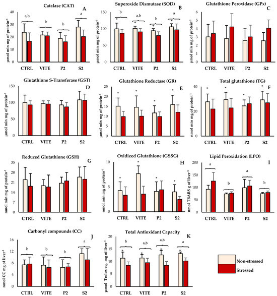 Antioxidant enzyme activity, glutathione quantification, lipid and protein oxidation, and total non-enzymatic antioxidant capacity of liver from fish fed with the experimental diets. Values are presented as mean ± standard deviation (n = 12). A 2-way ANOVA was performed, where different superscript lowercase letters (a,b) indicate differences between diets, while “*” indicates differences between the stressed and non-stressed groups (p < 0.05).