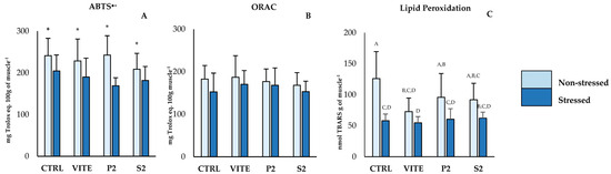 Lipid peroxidation values in fish muscle. Values are presented as mean ± standard deviation (n = 12). A 2-way ANOVA was performed, where “*” indicates differences between the stressed and non-stressed groups, and different superscript uppercase letters (“A, B, C, D”) indicate interaction differences between the variables “Stress” and “Diet” (p < 0.05).