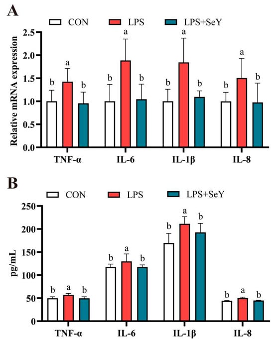 Effect of SeY on the mRNA expression and protein levels of inflammatory cytokines in LPS-induced PMECs. (A) mRNA expression levels of inflammatory cytokines. (B) Concentrations of inflammatory cytokines. Data are presented as means ± SEM (n = 6). Bars labeled with different letters (a, b) indicate significant differences between groups (p < 0.05). Experimental groups: CON (control, untreated cells), LPS (cells treated with 50 μg/mL LPS), and LPS + SeY (cells pretreated with 1 μM SeY followed by 50 μg/mL LPS).