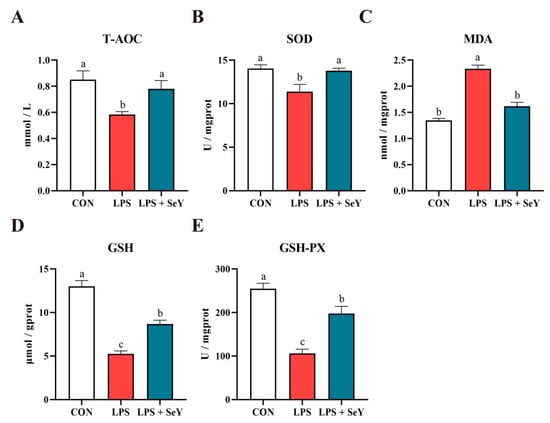 Effect of SeY on the antioxidant capacity of LPS-induced PMECs. (A) Levels of total antioxidant capacity (T-AOC), (B) superoxide dismutase (SOD), (C) malondialdehyde (MDA), (D) glutathione (GSH), and (E) glutathione peroxidase (GSH-Px) were measured using antioxidant detection kits. Data are presented as means ± SEM (n = 6). Bars labeled with different letters (a, b, and c) indicate significant differences between groups (p < 0.05). Experimental groups: CON (control, untreated cells), LPS (cells treated with 50 μg/mL LPS), and LPS + SeY (cells pretreated with 1 μM SeY followed by 50 μg/mL LPS).