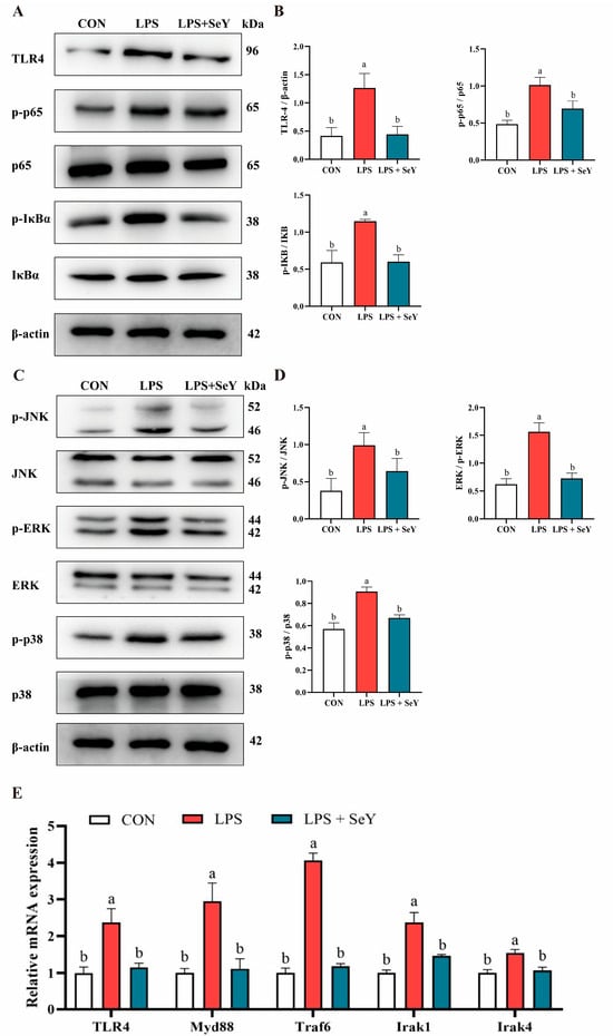 LPS treatment markedly enhanced the phosphorylation of key NF-κB (IκBα and p65) and MAPK (JNK, ERK, and p38) signaling proteins compared to the control group (p < 0.05), indicating robust activation of these inflammatory pathways (Figure 4A–D). SeY pretreatment effectively suppressed this phosphorylation, restoring levels close to those of the controls (p < 0.05), suggesting its inhibitory effect on LPS-induced NF-κB and MAPK activation (Figure 4A–D). Similarly, SeY pretreatment significantly attenuated the LPS-induced upregulation of Myd88, Irak4, Irak1, and Traf6 mRNA expression (p < 0.05), further demonstrating its regulatory role in suppressing TLR4-mediated inflammatory signaling (Figure 4E).