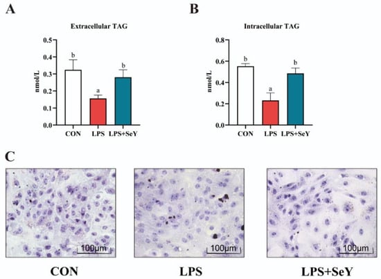 Effect of SeY on intracellular and extracellular triglyceride levels and lipid droplet formation in LPS-induced PMECs. (A) Extracellular triglyceride content in PMECs. (B) Intracellular triglyceride (TAG) content in PMECs. (C) Oil Red O staining showing lipid droplet formation in PMECs. Data are presented as means ± SEM (n = 3). Bars labeled with different letters (a, b) indicate significant differences between groups (p < 0.05). Experimental groups: CON (control, untreated cells), LPS (cells treated with 50 μg/mL LPS), and LPS + SeY (cells pretreated with 1 μM SeY followed by 50 μg/mL LPS).
