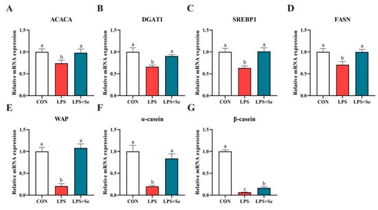 Effect of SeY on the mRNA expression of genes related to milk fat and milk protein synthesis in LPS-induced PMECs. mRNA expression levels of acetyl-CoA carboxylase alpha (ACACA) (A), diacylglycerol O-acyltransferase 1 (DGAT1) (B), sterol regulatory element-binding protein 1 (SREBP1) (C), fatty acid synthase (FASN) (D), whey acidic protein (WAP) (E), alpha-casein (α-casein) (F), and beta-casein (β-casein) (G) in PMECs. Data are presented as means ± SEM (n = 3). Bars labeled with different letters (a, b, and c) indicate significant differences between groups (p < 0.05). Experimental groups: CON (control, untreated cells), LPS (cells treated with 50 μg/mL LPS), and LPS + SeY (cells pretreated with 1 μM SeY followed by 50 μg/mL LPS).