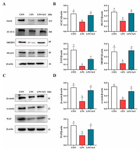 LPS significantly downregulated the mRNA expression of key molecules involved in milk fat and protein synthesis, including ACACA, DGAT1, SREBP1, FASN, WAP, α-casein and β-casein, compared to the control group (Figure 6, p < 0.05). In the LPS + SeY group, mRNA levels of these molecules were significantly higher than those in the LPS group (p < 0.05). Consistently, the protein expression of these molecules was also significantly higher in the SeY-pretreated cells than in the LPS group (Figure 7A,B). These results suggest that SeY effectively counteracts LPS-induced suppression of milk fat and protein synthesis.
