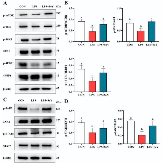 Impact of SeY on milk synthesis signaling pathways in LPS-induced PMECs. (A,B) Activation of the mechanistic target of rapamycin (mTOR) signaling pathway in PMECs. (C,D) Activation of the Janus kinase 2-signal transducer and activator of transcription 5 (JAK2-STAT5) signaling pathway in PMECs. The data are the means ± SEM (n = 3). Bars labeled with different letters (a, b) indicate significant differences between groups (p < 0.05). Experimental groups: CON (control, untreated cells), LPS (cells treated with 50 μg/mL LPS), and LPS + SeY (cells pretreated with 1 μM SeY followed by 50 μg/mL LPS).