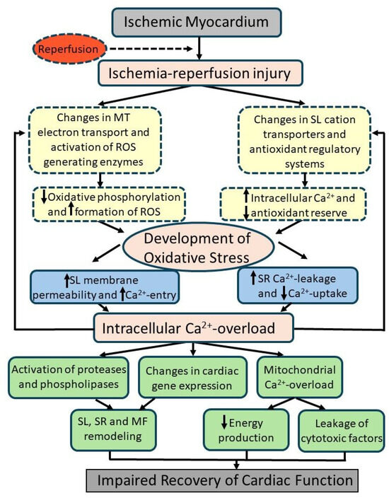 It is now well known that myocardial ischemia induces marked alterations in contractile function, cellular metabolism, and cardiac ultrastructure due to the lack of both oxygen and substrates. Although the reperfusion of the ischemic myocardium is beneficial in improving cardiac function and myocardial changes, delayed reperfusion, after a certain critical time of ischemic insult, has been shown to impair the recovery of cardiac function and exacerbate metabolic alterations, induce Ca2+-handling abnormalities, and promote damage to the myocardial structure [1,2,3,4,5,6,7,8,9,10,11,12,13,14,15]. The effects of delayed reperfusion are superimposed upon those for myocardial ischemia and are termed as ischemia–reperfusion (I/R) injury. Although the nature of defects due to I/R injury is not fully understood, this condition is generally associated with several adverse events such as arrhythmias, diverse signal transduction defects, mitochondrial dysfunction, microvascular damage, and cellular death. Furthermore, I/R injury is invariably seen in clinical conditions including acute coronary syndrome, angioplasty, thrombolysis, coronary-bypass surgery, cardiac transplantation, and stroke [16,17,18,19,20,21,22,23,24,25,26,27,28,29,30,31,32,33,34,35]. It should be mentioned that I/R injury is a complex health hazard, and the mechanisms of I/R-induced cardiac dysfunction are similar to those for hypoxia reoxygenation.