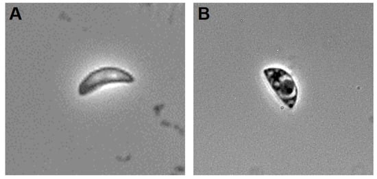 Photomicrographs of RH-strain Toxoplasma gondii tachyzoites from phase-contrast microscopy (60×). (A) Control without treatment; regular crescent shape is observed. (B) When exposed to Hsf1 at 23.6 μg/mL for 60 min, morphological alterations are observed, such as loss of crescent shape and a regular size.