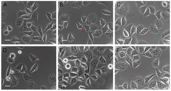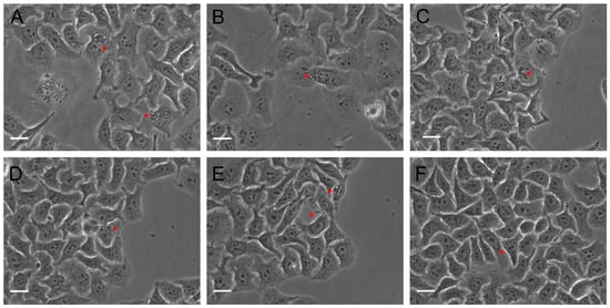 Effect of Hsf1 on parasite adhesion. Extracellular tachyzoites were treated with different concentrations and then exposed to HEp-2 cells for 15 min to assess adhesion. (A) Untreated, (B) 0.1% DMSO, (C) 15 µg/mL pyrimethamine, (D) 11.8 µg/mL, (E) 23.6 µg/mL, and (F) 47.2 µg/mL. Tachyzoites (red arrowheads) are shown. Scale bars = 20 µM.