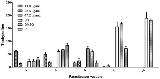 Effect of Hsf1 on intracellular tachyzoite proliferation. Data collected in triplicate counts using phase-contrast microscopy within a population of 500 parasitophorous vacuoles. Invasion percentage of the host cell was assessed after 48 h of incubation with tachyzoites previously treated with Hsf1. S/T: without treatment; P: 15 µg/mL pyrimethamine; DMSO: 0.1%. The evaluations were performed in triplicate, with a standard error below ±0.27; p > 0.05.