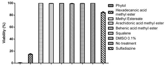 According to our previous results, the analysis of Hsf1 led to the identification of 18 compounds, primarily terpenes and methyl ester fatty acids [15]. Six commercially available compounds were evaluated for their effects on the viability of the extracellular tachyzoites [phytol, hexadecanoic acid methyl ester, methyl ester, arachidonic acid methyl ester, behenic acid methyl ester, and squalene (Sigma-Aldrich, St. Louis, MO, USA)]. Tachyzoites were previously purified from a mouse 5 days post-infection and exposed to [100 µg/mL] of each compound in PBS (pH 7.2) for 1 h at room temperature. As a control, sulfadiazine, 0.1% DMSO, and untreated tachyzoites were included. After exposure, tachyzoites were washed with PBS and stained with Sytox Green. Stained tachyzoites were imaged using phase-contrast/fluorescence microscopy, and viability was expressed as a percentage based on a population count of 500 parasites [15].