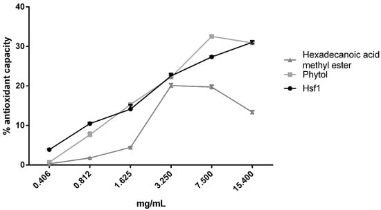 The antioxidant capacities of Hsf1, phytol, and hexadecanoic acid methyl ester were determined using the oxygen radical absorbance capacity (ORAC) method. A freshly prepared fluorescein (125 µL of a 75 µM solution) was mixed with 50 µL concentrations of the extract (15.4, 7.5, 3.25, 1.63, 0.82, and 0.41 mg/mL) in a black 96-well plate and incubated for 30 min at 37 °C. After incubation 25 µL (10 µM) of AAPH (2,2′-azobis-2-methyl-propanimidamide) was added [22]. Fluorescence measurements were taken every minute for 30 min using a TECAN infinite M10000PRO multiplate reader (Männedorf, Switzerland) with an excitation wavelength of 485 nm and emission wavelength of 520 nm. The percentage of inhibition was determined using the following formula: