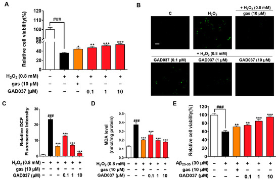 Neuronal oxidative stress promotes α-synuclein aggregation and the formation of Aβ deposits [31]. Moreover, Aβ deposits can mediate oxidative stress, thereby forming a vicious cycle [32]. Antioxidants such as resveratrol and curcumin have been reported to ameliorate cognitive function by inhibiting oxidative stress and reducing Aβ deposition [33,34]. Gas has antioxidant and neuroprotective effects [35]. Accordingly, we compared the protection of gas and GAD037 on PC12 cells under oxidative stress and Aβ conditions. The results in Figure 2 indicate that GAD037 produced neuroprotection via antioxidative stress and reduction of Aβ toxicity. Its antioxidant capacity and ability to reduce Aβ toxicity were stronger than that of gas.