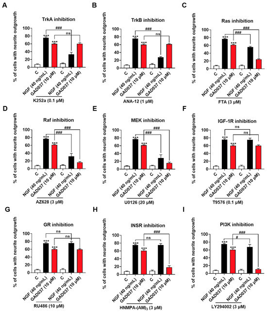 To screen candidate target proteins of GAD037, a specific inhibitor experiment was conducted. Numerous signaling pathways associated with promoting neurite outgrowth promotion have been reported. Neurotrophic factors, such as NGF and brain-derived neurotrophic factor (BDNF), have been shown to interact specifically with the tyrosine kinase receptors TrkA and TrkB, activating downstream kinases that facilitate neurite outgrowth, differentiation, and cell survival [8]. Neurotrophin signaling is mediated by several pathways [25], including the Ras/Raf/MEK/ERK and PI3K/Akt pathways driven by tyrosine kinases. Furthermore, phosphorylation of IGF-1R and INSR has been demonstrated to trigger downstream signaling cascades that may modulate cell metabolism and promote neurite outgrowth [13,26]. It has also been suggested that GR is involved in the neurogenic activity of PC12 cells [20]. Consequently, we evaluated whether the treatment with inhibitors of these proteins influenced the NGF-mimic activity induced by GAD037. As illustrated in Figure 3A,B, the NGF-mimic activity of GAD037 remained unchanged following treatment with TrkA and TrkB inhibitors, which indicates that these receptors are not involved in the NGF-mimic activity of GAD037 in PC12 cells. Additionally, a significant reduction in the number of cells exhibiting neurite outgrowth was observed with the treatment with inhibitors targeting Ras, Raf, and ERK (FTA, AZ628, and U0126). As shown in Figure 3C–E, the percentage of neurite outgrowth decreased from 61.3% ± 0.9% to 24.3% ± 0.9%, 16.3% ± 1.2%, and 15.7% ± 1.5%, respectively. These results suggest that the Ras/Raf/MEK signaling pathway may play a critical role in the NGF-mimic activity of GAD037, independent of Trk receptors. Furthermore, as shown in Figure 3F,G, treatment with inhibitors of GR and IGF-1R (RU486 and T9576) did not markedly alter the neurite outgrowth induced by GAD037. Notably, after treatment with INSR and PI3K inhibitors (HNMPA-(AM)3 and LY294002) GAD037-induced neurite outgrowth was significantly reduced from 60.8% ± 1.5% to 18.3% ± 1.9% (Figure 3H), and 10.8% ± 1.1% (Figure 3I). These findings indicate that INSR is a candidate target of GAD037, and that the Ras/Raf/MEK and PI3K/Akt signaling pathways contribute to the NGF-mimic activity of GAD037.