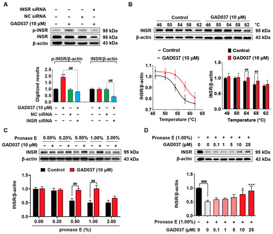 Identification of INSR as one of potential targets of GAD037. (A) Western blot analysis and digitalized results of INSR protein and phosphorylated INSR protein following transfection with either INSR siRNA or NC siRNA, and GAD037 treatment for 2 h. (B) Western blot analysis and digitalized results of INSR protein after being treated with GAD037 at 10 µM for 4 h and heating samples at different temperatures, respectively. (C) PC12 cell lysates and GAD037 at 10 µM were incubated for 3 h at room temperature and digested with pronase E of different concentrations for 25 min, and INSR protein in lysates was determined by Western blot analysis. (D) PC12 cell lysates and different concentrations of GAD037 were incubated for 3 h at room temperature and digested with pronase E (0 or 1:100 dilution) for 25 min, and INSR protein in lysates was determined by Western blot analysis. In (A–C), the black, red, green, blue columns represent the control, GAD037, NC siRNA, INSR siRNA + GAD037 groups, respectively. In (D), the black, light pink, pink, red represent the control, pronase E, pronase E + GAD037 (0.1, 1, 5 µM), pronase E + GAD037 (10, 25 µM) groups, respectively. For Western blot analysis, three 6 cm dishes were repeated for each group, and extracted proteins were mixed and sampled. Data are presented as mean ± SEM. * p < 0.05, ** p < 0.01, and *** p < 0.001 represent significant differences compared with control group; ## and ### indicate significant differences at p < 0.01 and p < 0.001, respectively.