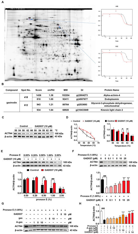Identification of ACTN4 as a target of GAD037. (A) The results of 2DE-CETSA following treatment with gas at various temperatures in HeLa cells. (B) The LC-MS/MS analysis results for each spot in (A). (C) The Western blot analysis and (D) digitalized results of ACTN4 protein at varying temperatures following treatment with GAD037 at 10 µM for 4 h. (E) The PC12 cell lysates and GAD037 at 10 µM were incubated for 3 h at room temperature and digested with pronase E of different concentrations for 25 min, and ACTN4 protein in the lysates was determined by Western blot analysis. (F) The PC12 cell lysates and different concentrations of GAD037 were incubated for 3 h at room temperature and digested with pronase E (0 or 1:100 dilution) for 25 min, and ACTN4 protein in the lysates was determined by Western blot analysis. The black, light pink, pink, red represent the control, pronase E, pronase E + GAD037 (0.1, 1, 5 µM), pronase E + GAD037 (10, 25 µM) groups, respectively. (G) The Western blot analysis and (H) digitalized results of the effects of different concentrations of A-gas, gas, and GAD037 on the protein stability of ACTN4 proteins in PC12 cells. In the Western blot experiment, three dishes were also set for each group, and the extracted proteins were mixed and sampled. The data are presented as the mean ± SEM. * p < 0.05 and *** p < 0.001 represent significant differences compared with the control group; ## and ### indicate significant differences at p < 0.01 and p < 0.001, respectively.