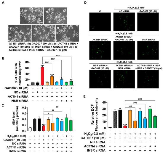 In neurons, ACTN4 promotes dendrite protrusions and maintains neuronal structure [36]. In addition, INSR signaling has been shown to affect neurite outgrowth in cultured sympathetic and sensory neurons [37] and take part in maintaining intracellular redox balance by regulating glucose metabolism [38]. To clarify how INSR and ACTN4 regulate the NGF-mimic and neuroprotective activities of GAD037, we employed siRNA to knock down the expression of INSR and ACTN4, followed by an assessment of changes in the NGF-mimic activity of GAD037 as well as ROS and MDA levels post-treatment with H2O2 and GAD037. The results presented in Figure 6 reveal that INSR and ACTN4 work synergistically to enhance the NGF-mimic activity. Meanwhile, they contribute to improving cellular resistance to oxidative damage; this effect does not occur synergistically.