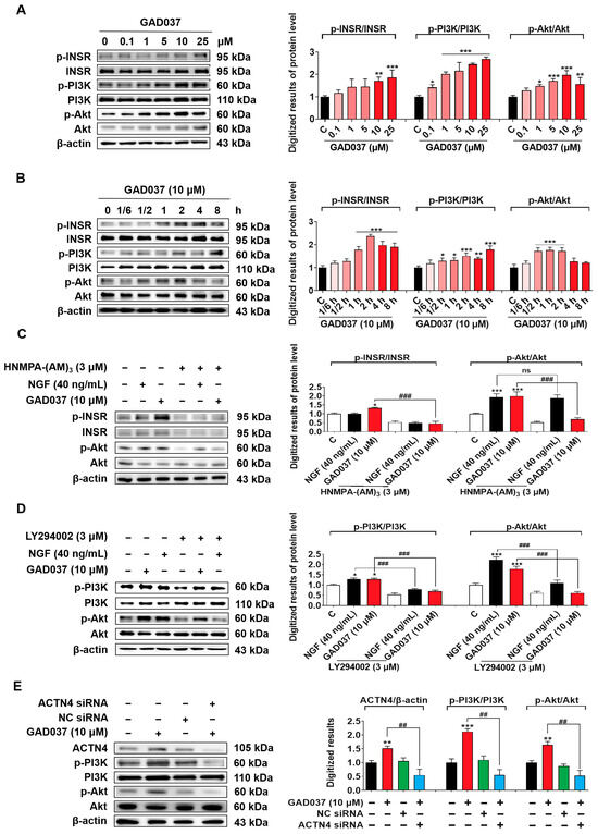 The PI3K/Akt signaling pathway is involved in the NGF-mimic activity induced by GAD037. (A) The Western blot analysis and digitalized results of the phosphorylation levels of INSR, PI3K, and Akt induced by GAD037 in a concentration-dependent manner (B) and time-dependent manner. In (A), the black, pink, red represent the control, GAD037 (0.1, 1, 5 µM), GAD037 (10, 25 µM) groups, respectively. In (B), the black, light pink, pink, red represent the control, GAD037 (1/6 h), GAD037 (1/2 h, 1 h, 2 h), GAD037 (4 h, 8 h) groups, respectively. (C) The Western blot analysis and digitalized results of the phosphorylation levels of INSR and Akt treated with the INSR inhibitor and subsequently GAD037 or NGF for 2 h. (D) The Western blot analysis and digitalized results of the phosphorylation levels of PI3K and Akt treated with PI3K inhibitor and subsequently GAD037 or NGF for 2 h. (E) The Western blot analysis and digitalized results of the ACTN4 protein and phosphorylated PI3K and Akt protein following transfection with either ACTN4 siRNA or NC siRNA and GAD037 treatment for 2 h. For the Western blot analysis, three dishes were used to repeat for each group, and the extracted proteins were mixed as samples. The data are presented as the mean ± SEM. * p < 0.05, ** p < 0.01, and *** p < 0.001 represent significant differences compared with the control group; ns indicates no significant differences; ## and ### indicate significant differences at p < 0.01 and p < 0.001, respectively.