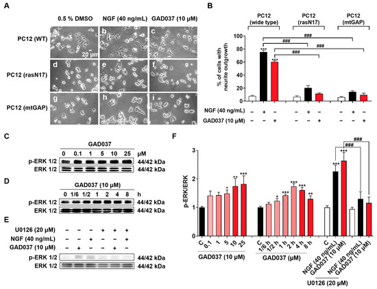 Ras/Raf/MEK/ERK signaling pathway is involved in NGF-mimic activity of GAD037. (A) Morphological changes of PC12 cells after treatment with GAD037 or NGF in wide-type or Ras mutant PC12 cells: (a) control (0.5% DMSO) in wide-type; (b) NGF (40 ng/mL) in wide-type; (c) GAD037 (10 µM) in wide-type; (d) control (0.5% DMSO) in Ras mutant PC12 cells (rasN17); (e) NGF (40 ng/mL) in Ras mutant PC12 cells (rasN17); (f) GAD037 (10 µM) in Ras mutant PC12 cells (rasN17); (g) control (0.5% DMSO) in Ras mutant PC12 cells (mtGAP); (h) NGF (40 ng/mL) in Ras mutant PC12 cells (mtGAP); (i) GAD037 (10 µM) in Ras mutant PC12 cells (mtGAP). (B) Percentage of neurite outgrowth induced by GAD037 or NGF for 48 h in wide-type or Ras mutant PC12 cells. (C) Western blot analysis for phosphorylation levels of ERK induced by GAD037 in concentration-dependent manner (D) and time-dependent manner. (E) Western blot analysis for ERK phosphorylation treated with MEK inhibitor and subsequently GAD037 or NGF for 2 h. (F) Digitalized results of (C–E). In (F), the black, pink, red represent the control, GAD037 (0.1, 1, 5 µM), GAD037 (10, 25 µM) groups, respectively. During Western blot experiment, three dishes were also set for each group, and extracted proteins were mixed as samples. Data are presented as mean ± SEM. * p < 0.05, ** p < 0.01, and *** p < 0.001 represent significant differences compared with control group; ### indicates significant differences at p < 0.001.