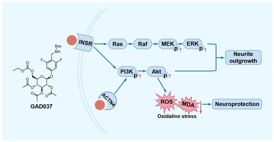 The proposed mechanism of action of GAD037. GAD037 with neuroprotection promotes neurite outgrowth by targeting INSR and ACTN4 to activate the PI3K/Akt and Ras/Raf/MEK/ERK signaling pathways. The up arrow represents an increase in the protein phosphorylation level. The down arrow represents a reduction in the ROS and MDA levels.