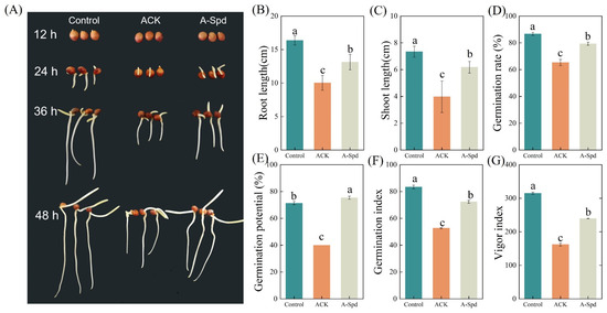Effect of exogenous Spd treatment on germination of aged sorghum seeds. (A) Phenotypic. (B) Root length (cm). (C) Shoot length (cm). (D) Germination rate (%). (E) Germination potential (%). (F) Germination index. (G) Vigor index. Control, unaged sorghum seeds. ACK, aged sorghum seeds. A-Spd, Spd solution, and aged sorghum seeds. For each treatment, values were obtained from three biological repeats (n = 3). Different letters above the bars are statistically different by a least significant difference test (p < 0.05).