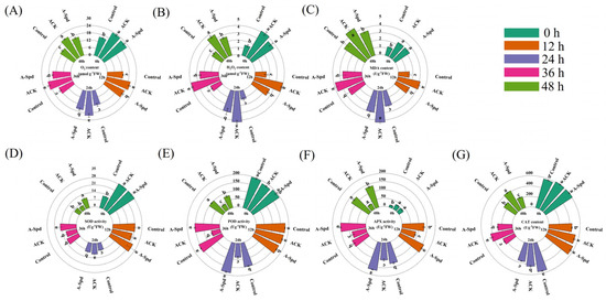 Exogenous Spd treatment significantly increased SOD activity of aged seeds during germination, with increases of 45.2% and 113.0% at 36 h and 48 h, respectively, compared with ACK treatment (Figure 2D). Exogenous Spd treatment also significantly increased POD activity. Compared with the Control treatment, the POD activity of ACK treatment was lower from 12 to 48 h. In contrast, the POD activity of the A-Spd treatment was significantly higher than in the A-Spd treatment, except for 0 h (Figure 3E). Similarly, exogenous Spd treatment significantly increased APX activity, which was significantly decreased in ACK treatment compared with the Control treatment from 0 to 48 h. Compared with ACK treatment, the APX activity of A-Spd treatment was significantly higher except for 0 h (Figure 3F). Exogenous Spd treatment did not significantly increase CAT activity from 0–12 h. Compared with ACK treatment, CAT activity in A-Spd treatment was significantly decreased by 17.7%, 5.1%, and 34.7% from 24 to 48 h, respectively (Figure 3G).