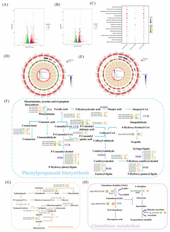 The differentially expressed genes (DEGs) of all comparison groups were combined for hierarchical clustering analysis. Compared with the Control group, the transcriptional level of ACK significantly decreased after germination, with the most pronounced reduction observed in genes related to antioxidant metabolism. In contrast, the transcriptional level of A-Spd showed a marked increase compared to the ACK, particularly in DEGs associated with antioxidant defense. The gene expression levels were similar to those in the Control treatment (Figure S1). The DEGs were analyzed across all comparison groups: Control vs. ACK, Control vs. A-Spd, and ACK vs. A-Spd, identifying a total of 2616 DEGs (Figure 3A,B). Among them, the numbers of up-regulated DEGs were 1176, 385, and 955, respectively, and the numbers of down-regulated DEGs were 1440, 122, and 633, respectively. In order to gain a deeper understanding of the functions of these DEGs, the metabolic pathways involved in the DEGs that responded to exogenous Spd after treatment were investigated through the kyoto encyclopedia of genes and genomes (KEGG) database annotations. The enriched metabolic pathways of Control vs. ACK and ACK vs. A-Spd comparison groups were mainly analyzed. In KEGG, the numbers of annotated DEGs in the Control vs. A-Spd and ACK vs. A-Spd comparison groups were 796 and 518, respectively. The number of DEGs enriched in each KEGG pathway was counted and sorted, with the top 21 pathways depicted in Figure 3D,E, and the top 17 pathways in Figure 3C. The present study found that 26 genes were significantly up-regulated in the control group of ACK vs. A-Spd in the phenylpropanoid biosynthesis pathway, which is one of the biological pathways for plant antioxidant production. The annotated cinnamoyl-CoA reductase (CCRs, Sobic.004G340200.v3.2), PODs (Sobic.001G444500.v3.2, Sobic.001G235800.v3.2, Sobic.002G003500.v3.2, Sobic.007G014200.v3.2, Sobic.002G003500.v3.2, Sobic.001G293200.v3.2, Sobic.001G360500.v3.2, Sobic.005G104100.v3.2) significantly up-regulated (Figure 4D). In the flavonoid biosynthesis pathway, six key genes were up-regulated, including chalcone synthase (CHS, Sobic.005G107800.v3.2), flavonoid 3-hydroxylase (F3H, Sobic.005G149600.v3.2), flavone synthase II (FNSII, Sobic.006G001000.v3.2), CTs(Sobic.006G227000.v3.2, Sobic.006G227800.v3.2) (Figure 4E). Additionally, four key genes in the glutathione metabolism pathway were up-regulated, including glutathione S-transferase (GSTs, Sobic.008G079500.v3.2), Class III peroxidases (Prxs, Sobic. 002G391100.v3.2), ODC (Sobic.002G282900.v3.2), and APX (Sobic. 006G204000.v3.2) (Figure 4F).