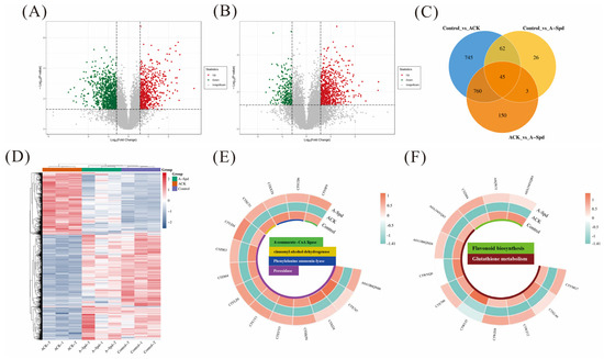 Proteome analysis of aged sorghum seeds treated with Spd. (A) The volcano map of the Control vs. ACK comparison group. (B) The volcanic map of the ACK vs. A-Spd comparison group. (C) Venn diagram of the three comparison groups (blue, Control vs. ACK; yellow, Control vs. A-Spd; orange, ACK vs. A-Spd). (D) The thermal map of proteins presenting the relative contents of proteins. (E) Thermogram of differential protein in phenylpropanoid biosynthesis pathway. (F) Thermogram of differential protein in flavonoid biosynthesis and glutathione metabolism. Control, unaged sorghum seeds. ACK, aged sorghum seeds. A-Spd, Spd solution, and aged sorghum seeds. For each treatment, values were obtained from three biological repeats (n = 3).