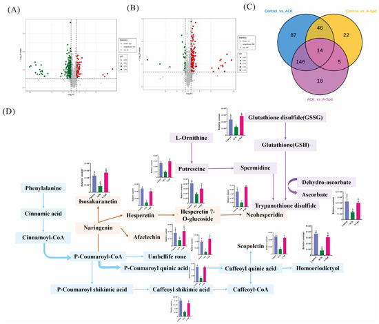 Metabolomic response of aged sorghum seeds with Spd. (A) The volcano map of the Control vs. ACK comparison group. (B) The volcanic map of the ACK vs. A-Spd comparison group. (C) Venn diagram of the three comparison groups. (blue, Control vs. ACK; yellow, Control vs. A-Spd; purple, ACK vs. A-Spd) (D) Changes in differential metabolite content in the KEGG pathway of phenylpropanoid biosynthesis (blue), flavonoid biosynthesis (yellow), and glutathione metabolism (purple). Control, unaged sorghum seeds. ACK, aged sorghum seeds. A-Spd, Spd solution, and aged sorghum seeds. For each treatment, values were obtained from three biological repeats (n = 3).