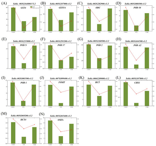 Effect of exogenous Spd treatment on relative expression of differentially genes in aged sorghum seeds. (A–N) transcript level of 14 selected DEGs analyzed by RT-qPCR (red line) and RNA-seq (bars). (A–C) Glutathione metabolism gene. (D–J) Phenylpropyl biosynthesis gene. (K–N) Flavonoid biosynthesis gene. Control, unaged sorghum seeds. ACK, aged sorghum seeds. A-Spd, Spd solution, and aged sorghum seeds. For each treatment, values were obtained from three biological repeats (n = 3).
