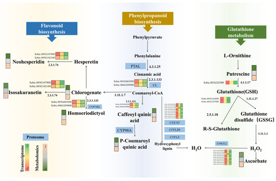 Analysis of the pathways by which exogenous Spd treatment affected germination of aging sorghum seeds revealed that the combined analysis of differential genes, differential proteins, and differential metabolites formed a physiological regulatory network for phenylpropanoid biosynthesis, flavonoid biosynthesis, and glutathione metabolism (Figure 7). KEGG pathway enrichment analysis of differential metabolites and differential genes showed that phenylpropanoid biosynthesis, flavonoid biosynthesis, and amino acid synthesis pathways were significantly enriched. Specifically, four differential metabolites and 40 differential genes were involved in this metabolic pathway in the phenylpropanoid organism (ko00940), with relative expression levels of related metabolites significantly decreasing after aging but significantly increased after exogenous Spd treatment (Figure S2). Pathway enrichment analysis was performed on the associated proteome and transcriptome to determine the most important biochemical metabolic pathways in which differentially expressed genes and their corresponding differential proteins were involved. A total of 50 differential genes and their corresponding differential proteins showed the same expression trend after exogenous Spd treatment in seed aging (Figure S3), showing a highly significant correlation between transcriptome and proteome. According to the KEGG enrichment results, 34 proteins and 4 metabolites were enriched in the phenylpropanoid biosynthesis pathway in ACK vs. A-Spd. The pathway diagram of the phenylpropanoid biosynthesis network (Figure S4) showed that four metabolites (5-O-P-coumaroyl-quinic acid, chlorogenic acid (3-O-caffeoyl-quinic acid, 5-O-caffeoyl-shikimic acid, and umbellulone) were found to be in the central range, and the remaining proteins and metabolites were directly or indirectly related to them. In the flavonoid biosynthesis pathway (Figure S4), eight metabolites (hesperetin, isosakuranetin, homoeriodictyol, 5-O-coumaroylquinic acid, chlorogenic acid, hesperein-7-O-neohesperidin, 5-O-caffeyl shikimic acid, and afzelechin) were central.