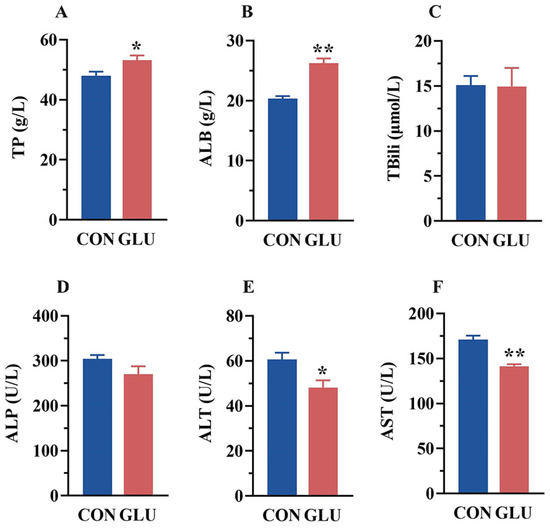 The serum biochemical parameters of piglets are shown in Figure 1. Compared with the CON group, the serum levels of TP and ALB were increased, whereas the serum levels of ALT and AST were decreased in the GLU group (p < 0.05). There was no significant difference in TBili and ALP between the CON and GLU groups of piglets (p > 0.05).