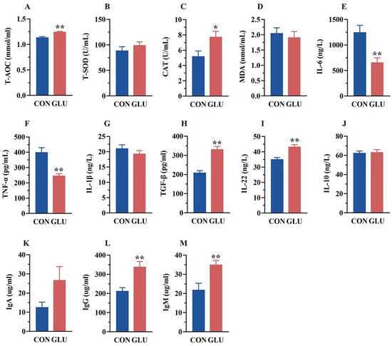 As shown in Figure 2, the serum T-AOC and CAT activities in the GLU group were significantly higher than those in the CON group (p < 0.05). Meanwhile, the serum concentrations of IL-6 and TNF-α in the GLU group (p < 0.05), whereas the concentrations of TGF-β and IL-22, were significantly higher than those in the CON group (p < 0.05). Compared with the CON group, the GLU group showed a significant increase in IgG and IgM concentrations (p < 0.05).