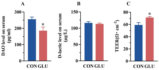 The concentrations of DAO and D-lactic acid in piglet serum are shown in Figure 3A,B. The DAO concentration in the serum of piglets in the GLU group was significantly lower than that in the CON group (p < 0.05). There was no significant difference in the concentration of D-lactic acid in the serum of piglets between the CON group and the GLU group (p > 0.05). Compared with the CON group (Figure 3C), the TEER value of piglets in the GLU group was significantly increased (p < 0.05).