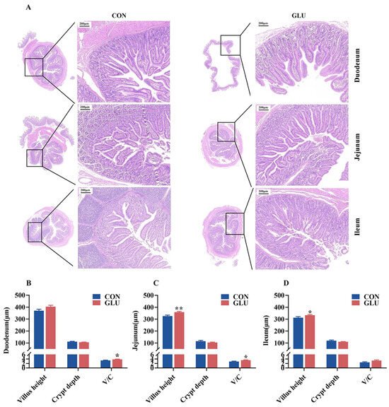Effect of dietary GLU supplementation on intestinal morphology in piglets. (A) H&E staining of piglet intestine; (B–D) analysis of villus height and crypt depth. CON, control group; GLU, glucuronolactone group. Values are presented as the mean ± SEM (n = 6). *, 0.01 < p ≤ 0.05, **, p ≤ 0.01.