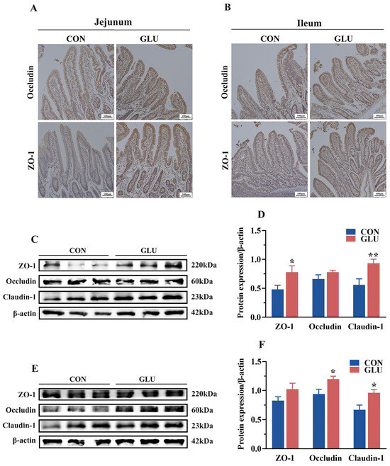 The expression levels of tight junctions in the jejunum and ileum are shown in Figure 5. An immunohistochemical analysis revealed the significantly heightened positive expression of ZO-1 and Occludin in the GLU group compared to that in the CON group (Figure 5A,B). Western blot analyses showed that the relative protein abundance of ZO-1 and Claudin-1 in the jejunum and Claudin-1 and Occludin in the ileum in the GLU group were significantly higher than those in the CON group (Figure 5C–F) (p < 0.05).