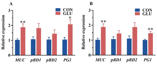 Effects of dietary GLU supplementation on the relative expression of mucins and porcine beta defensins in the intestines of piglets. (A) Jejunum; (B) ileum. MUC, mucin; pBD, porcine beta defensins; PG1, Protegrin-1. Values are presented as the mean ± SEM (n = 6). *, 0.01 < p ≤ 0.05, **, p ≤ 0.01.