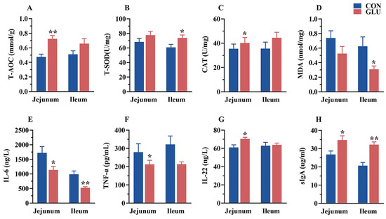 Effects of dietary GLU supplementation on antioxidant status and immune-inflammatory level in the intestines of piglets. (A–D) Antioxidative and oxidative indicators concentration; (E–G) inflammatory factor concentration; (H) secretory Immunoglobulin A. Values are presented as the mean ± SEM (n = 6). *, 0.01 < p ≤ 0.05, **, p ≤ 0.01.