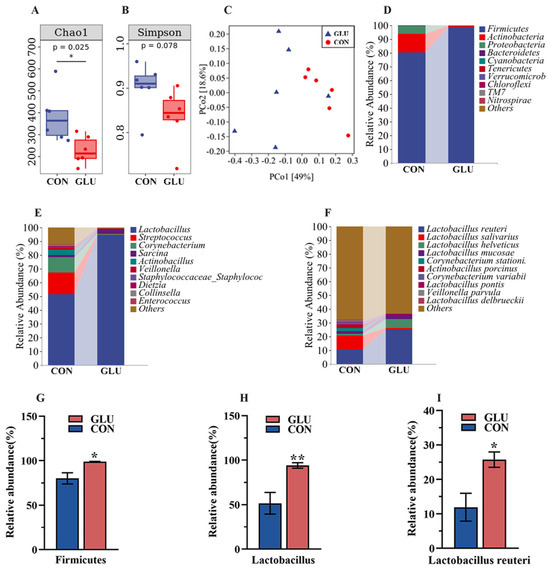 The analysis results of microbiota in the ileum of piglets are shown in Figure 8. The three major bacterial phyla in the ileal contents of piglets were Firmicutes (80.26% or 98.79%), Actinobacteria (13.49% or 1.01%), and Proteobacteria (5.95% or 0.07%), accounting for over 99% of the total bacterial community. Alpha diversity results showed a significantly lower Chao 1 index in the GLU group than in the CON group (p < 0.05), whereas the Simpson index did not show a statistically significant difference (Figure 8A,B). For the beta diversity, a Principal Coordinates Analysis (PCoA) revealed a distinct separation trend between GLU group and CON group (Figure 8C). At the phylum level, the relative abundance of Firmicutes in the GLU group was significantly higher than that in the CON group (p < 0.05). At the genus level, the relative abundance of Lactobacillus in the GLU group was significantly higher than that in the CON group (p < 0.05). At the species level, Lactobacillus reuteri was identified as the primary driver of change, with its abundance surging from 11.93% to 25.74% (Figure 8D–I) (p < 0.05).