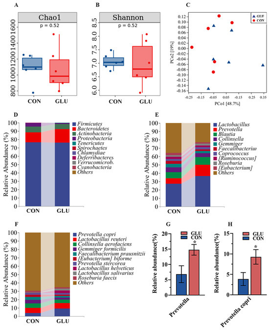 The analysis results of microbiota in the colons of piglets are shown in Figure 9. Three major bacterial phyla in the colonic contents of piglets were Firmicutes (76.59% or 76.00%), Bacteroidetes (11.83% or 16.46%), and Actinobacteria (6.98% or 5.81%), accounting for over 95% of the total bacterial community. Alpha diversity within the colon microbiome disclosed no statistically significant disparities in either the Chao 1 or Shannon indices between the GLU and CON group (Figure 9A,B). For the beta diversity, the PCoA analysis suggested that there was no marked differentiation between the GLU group and CON group (Figure 9C). At the genus level, the Prevotella abundance in GLU group was significantly higher than in the CON group. At the species level, Prevotella copri emerged as the predominant species driving this shift, with its prevalence escalating from 3.87% to 9.28% (Figure 9D–H) (p < 0.05).