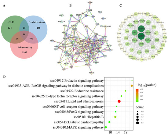 Network pharmacological analysis among GLU, oxidative stress, and inflammation. (A–C) Intersection analysis between GLU targets and the disease targets of oxidative stress and inflammatory, as well as screening of core targets; (D) the top 10 KEGG pathways.