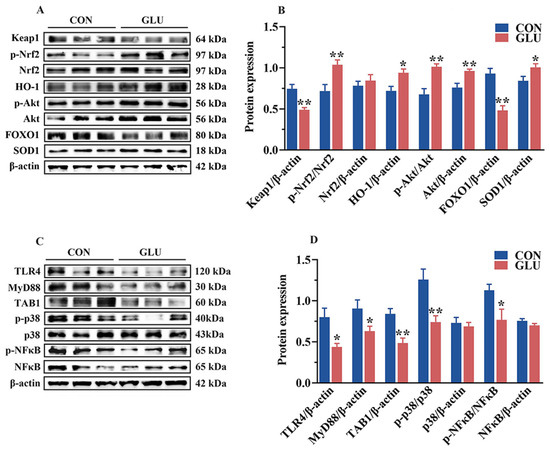 Next, Western blot analysis was performed to validate the functions of these pathways (Figure 11). In the jejunum of piglets, the phosphorylation of Akt and Nrf2 and the relative abundance of HO-1, Akt, and SOD1 proteins in the GLU group were significantly higher than those in the CON group (p < 0.05). However, the relative abundance of Keap1 and FOXO1 in the GLU group was significantly lower than that in the CON group (p < 0.05) (Figure 11A,B). In addition, compared to the CON group, the relative abundances of TLR4, MyD88, and TAB1 proteins, as well as the phosphorylation of p38 and NF-κB, were significantly decreased in the GLU group (Figure 11C,D), while there was no significant difference in the relative abundance of Nrf2, p38, and NF-κB (p > 0.05).